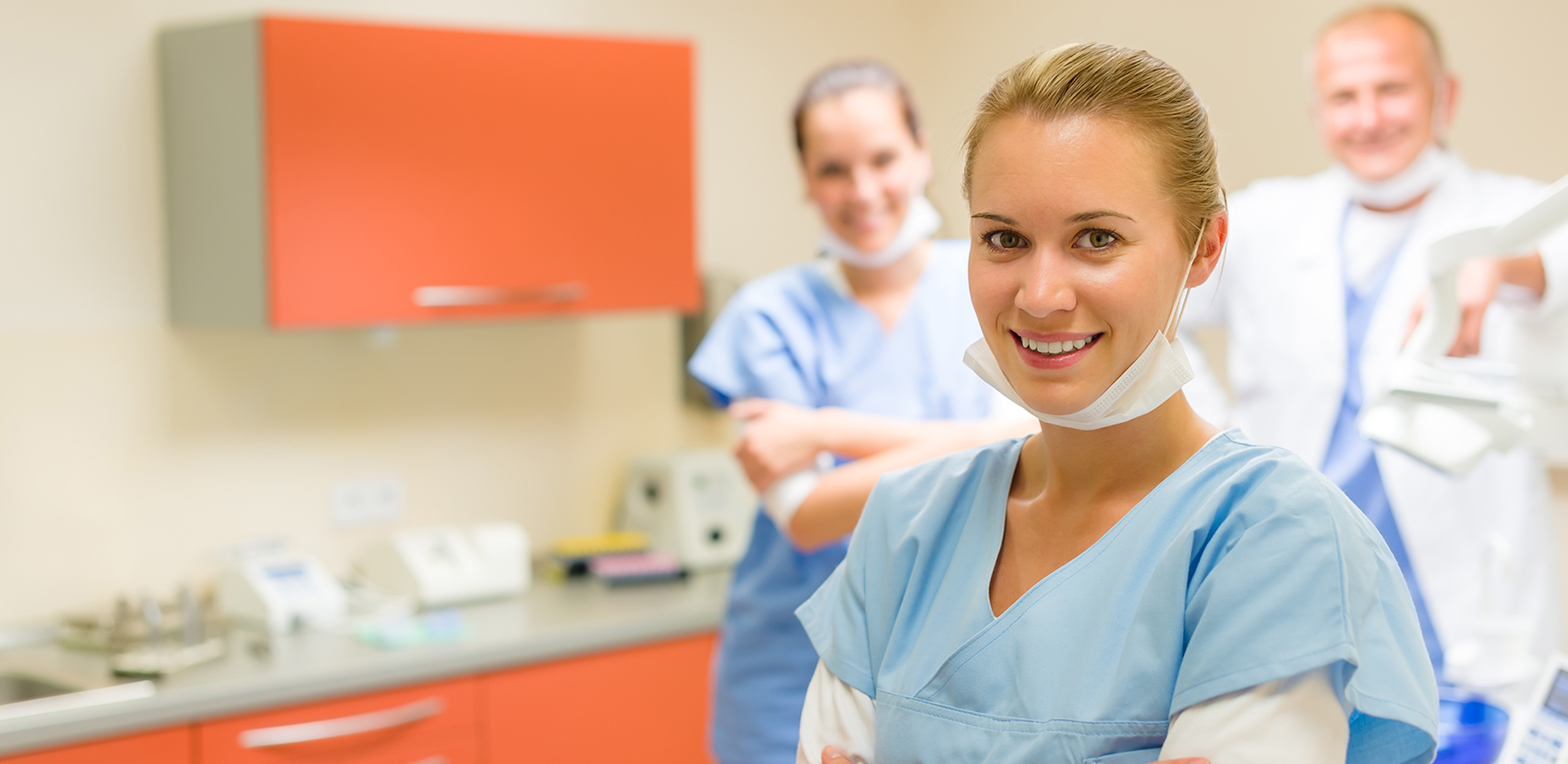 A dentist, also known as a dental surgeon, The dentist's supporting team providing oral health services.